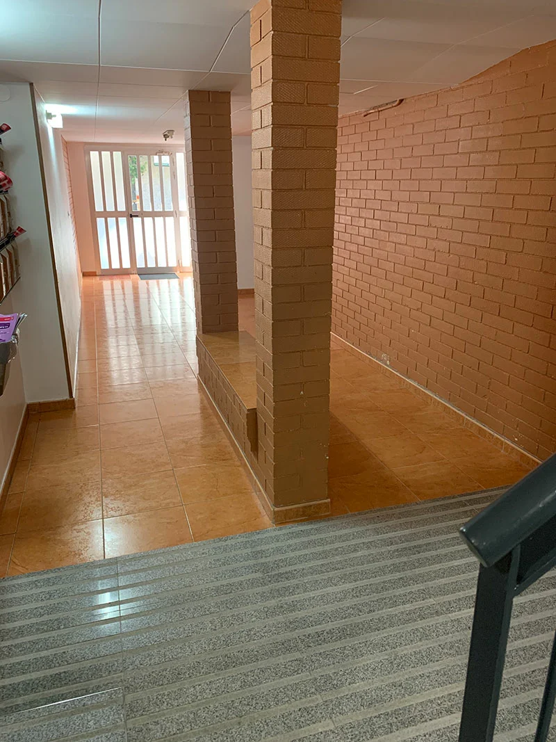 Instal·lació d’ascensor per a 6 persones per celobert, tirant totes les escales i refent-les de nou per embarcar a nivell d’habitatges.